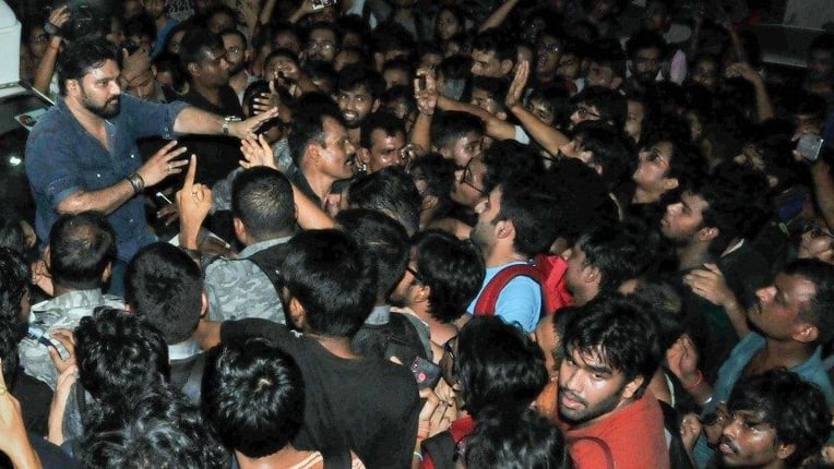 நிகழ்ச்சியில் பங்கேற்ற பிறகு வெளியே வந்த பிறகு அவருடைய காரை மாணவர்கள்